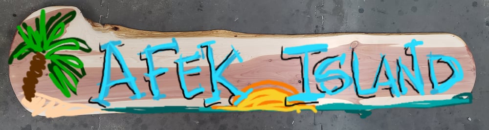 Live edge cedar measuring 50"x 9"...12" tall at the tallest part. Beach scene with a palm tree to the left. Teal lettering with "Afek Island". Hanging hardware will be D-ring hooks on the back. The sign is sealed with a minimum three coats of spar urethane. A picture is included of the back to show the coloring of the wood after the spar urethane is applied. Turn around time will be 2-3 weeks. Please understand, weather plays a big part in our processing time. The sealer requires three days of low humidity and no rain. Shipping is done through UPS.