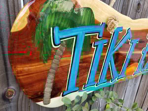 Custom quote for "Welcome to the Garcia's....Freaky Tiki". Live edge cedar measures approximately 15"x45" prior to sanding and cleaning the edges. Beach scene background with "pool blue" lettering (please see second listing picture for actual lettering color). Hanging hardware options can be rope or hooks on the back. Price includes spar urethane sealer on all sides.
