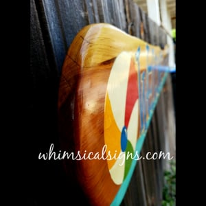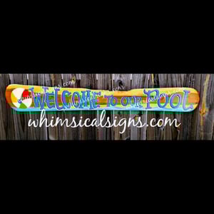 We use Behr Exterior Paint and Primer in One for the paint. The lettering is done by hand. The letters themselves have three coats of paint. Each letter is then shaded with a shadow of black paint and then white. The pool ball is painted with the same exterior paint and has a minimum of three coats. Once the sign is painted, we then use a spar urethane sealer. This is a multi step process. Most of these pieces have at least three coats of spar urethane. D-ring hooks are placed on the back of the piece for you to hang it from your pool house, fence or other structure.